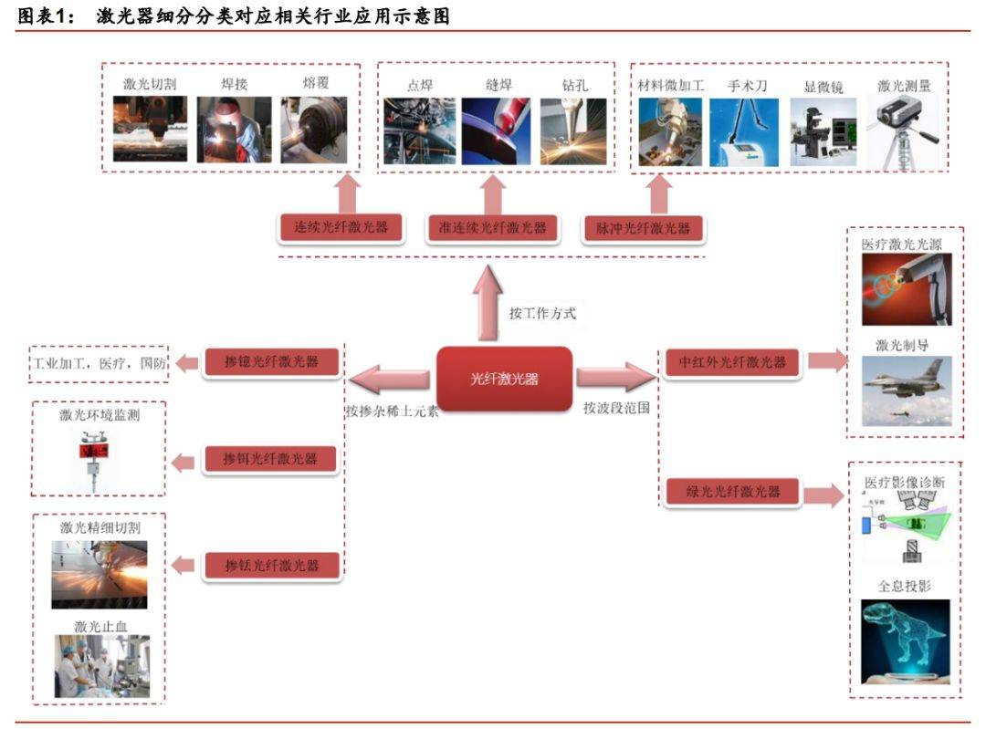 光纖激光器有多種分類方法,其中較為常見的是按工作方式分類、按波段范圍分類及按介質(zhì)摻雜稀土元素分類。激光器通常也是根據(jù)這三個(gè)分類中的一至兩個(gè)來命名的,例如 IPG的 YLM-QCW 系列即翻譯為準(zhǔn)連續(xù)摻鐿光纖激光器。光纖激光器應(yīng)用領(lǐng)域廣泛,不同細(xì)分的激光器特質(zhì)不同,適合的應(yīng)用領(lǐng)域各異。例如中紅外波段對(duì)于人眼來說是安全的,且在水中能夠被很強(qiáng)的吸收,是理想的醫(yī)用激光光源;摻鉺光纖由于其合適的波長可以打開光纖通信窗口,在光纖通信領(lǐng)域應(yīng)用較廣;綠光激光由于其可見性,在娛樂與投影等方面必不可少。