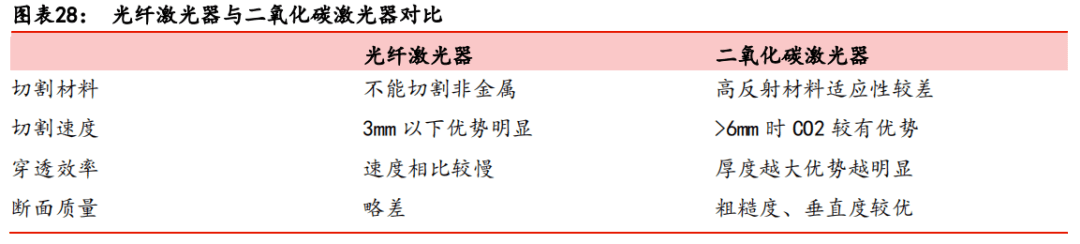 光纖與二氧化碳激光器各有所長,應(yīng)根據(jù)不同需求選取不同工具。從目前應(yīng)用最廣泛的切割加工技術(shù)來說,光纖激光器與CO2激光器在面對(duì)特定應(yīng)用需求時(shí)有其各自的優(yōu)勢與劣勢,并不能完全相互替代而需要互補(bǔ)共存。從加工材料類型來看,受限于吸收效果光纖激光器不適用于切割非金屬材料,而常規(guī)的CO2激光器不適用于切割銅材、鋁材等高反射率材料;從切割速度看,CO2 在厚度>6mm 板材有優(yōu)勢,而光纖激光器切割薄板速度較快;激光切割前需要進(jìn)行工件穿透,CO2穿孔速度明顯快于光纖激光器;從切割斷面質(zhì)量來看,CO2激光器整體優(yōu)于光纖激光器。