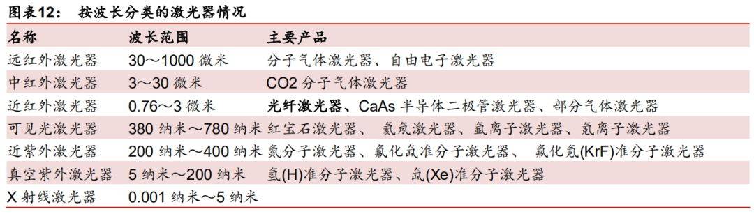 光纖激光器直接輸出的激光多為波長在960nm-2.05μm之間的近紅外光。激光器大類按照波長由短到長的順序涵蓋了從X射線到遠(yuǎn)紅外的各類激光器,波長從0.001納米到1000微米不等。其中光纖激光器直接輸出的激光主要在近紅外部分。但為了實(shí)現(xiàn)不同應(yīng)用需要,光纖激光器通過倍頻可以輸出可見光,主要應(yīng)用是綠光;通過在光纖中摻氟化物可以輸出中紅外光。