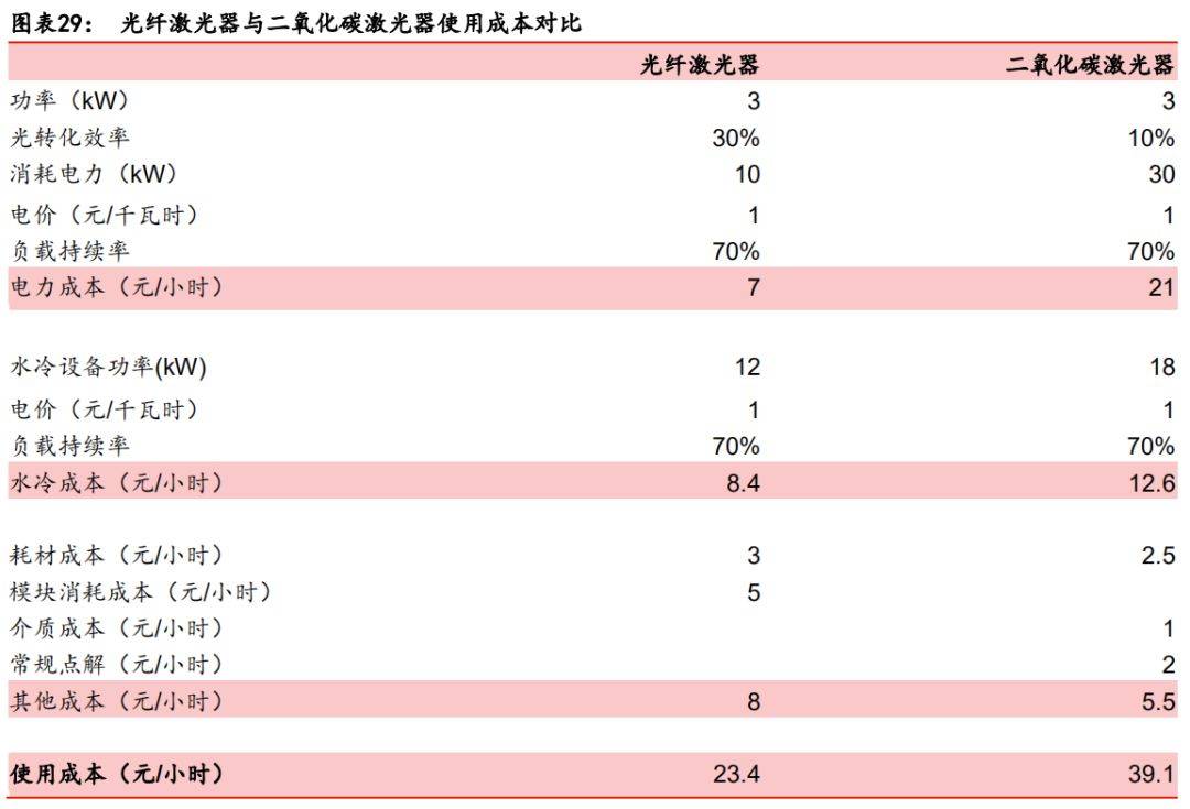 光纖激光器光轉(zhuǎn)化效率更高,使用成本較低。根據(jù)測算可得,光纖激光器的使用成本為 23.4 元/小時(shí),二氧化碳激光器的使用成本為 39.1 元/小時(shí),其中,光纖激光器電力成本為 7 元/小時(shí),水冷成本為 8.4 元/小時(shí),其他成本為 8 元/小時(shí);二氧化碳激光器電力成本為 21 元/小時(shí),水冷成本為 12.6 元/小時(shí),其他成本為 5.5 元/小時(shí)。