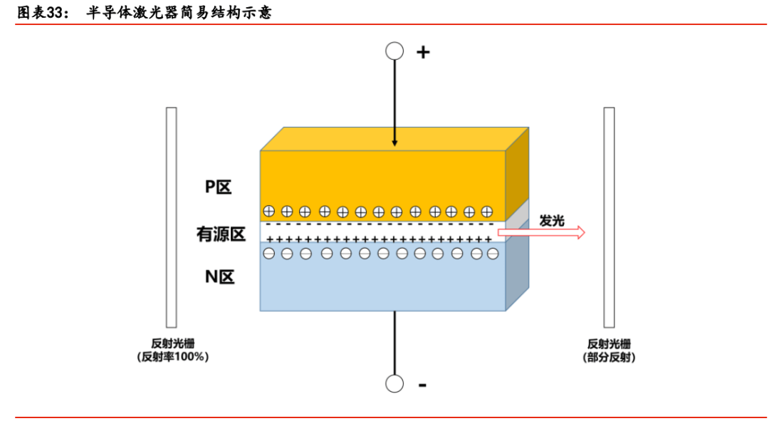 以電注入式半導(dǎo)體激光器為例,半導(dǎo)體材料中通常會(huì)添加GaAS(砷化鎵)、InAS(砷化銦)、Insb(銻化銦)等材料制作成半導(dǎo)體面結(jié)型二極管,當(dāng)對(duì)二極管注入足夠大的電流后,中間有源區(qū)中電子(帶負(fù)電)與空穴(帶正電)會(huì)自發(fā)復(fù)合并將多余的能量以光子的形式釋放,再經(jīng)過諧振腔篩選放大后形成激光。