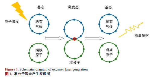 氣體紫外激光器主要有準分子激光器、氬離子激光器、氮分子激光器、氟分子激光器、氦鎘激光器等。準分子激光器等通常用于激光加工[2]。準分子激光器是以準分子為工作物質(zhì)的氣體激光器,它也是一種脈沖激光器,從 1971 年第一臺準分子激光器的誕生[3],就有了巨大的研究意義。準分子是一種不穩(wěn)定復合的分子,在一定情況下會分解成原子。重復頻率和平均功率為評判準分子激光器的依據(jù)。一定比例的 Ar、Kr、Xe 等的稀有氣體和 F、Cl、Br 等的鹵族元素相混合是紫外氣體激光器的主要工作物質(zhì),實現(xiàn)泵浦的方法是用電子束或脈沖放電達到。基態(tài)的惰性氣體原子和稀有氣體原子受激發(fā)后,核外電子從而被激發(fā)到更高的軌道使最外層電子層被填充滿,并與其他原子結(jié)合形成準分子,隨后躍遷回基態(tài)再分解成原來的原子,剩余能量以光子的形式分離出來最后經(jīng)過諧振腔的放大得到紫外激光如圖 1 所示[1]。液態(tài)氙為早期的準分激光器的工作物質(zhì)?,F(xiàn)在的準分子激光器還包括 193 nm 的 ArF 激光器,248 nm 的KrF 激光器和 308 nm 的 XeCl 激光等。