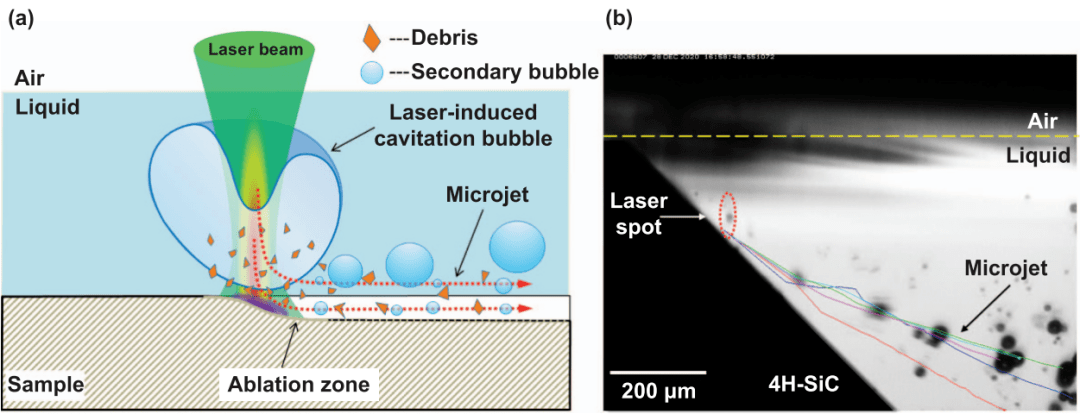 圖1(a)激光誘導(dǎo)微射流輔助燒蝕技術(shù)示意圖;(b)高速相機(jī)拍攝氣液固界面附近激光誘導(dǎo)微射流。