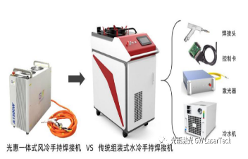 傳統(tǒng)的組裝式水冷手持焊接機主要包含焊接頭、控制卡、激光器、冷水機,這四個部件都是獨立且完整的設備,通過線路和管路連接到一起,再裝到一個機柜中去。