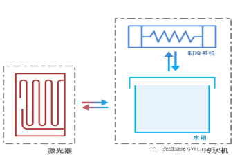 傳統(tǒng)的組裝式水冷手持激光焊接機是把冷水機和激光器組裝在一個大的機柜里面,通過冷水機來給激光器散熱:先通過制冷系統(tǒng)給水箱里的水制冷,再用循環(huán)的冷卻水帶走激光器產生的熱量。