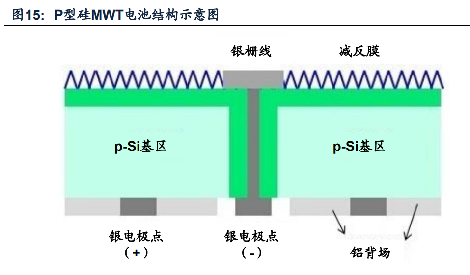 MWT激光開(kāi)孔技術(shù)可用于PERC電池,提升光電轉(zhuǎn)換效率約0.4%。MWT全稱為金 屬穿孔卷繞技術(shù),采用激光打孔、背面布線的技術(shù)消除正面電極的主柵線,正面電 極細(xì)柵線搜集的電流通過(guò)孔洞中的銀漿引到背面。此設(shè)計(jì)下,光伏電池的正負(fù)電極 點(diǎn)都分布在電池片背面,有效減少了正面柵線的遮光,提高光電轉(zhuǎn)換效率,同時(shí)能 降低銀漿消耗量和金屬電極-發(fā)射極界面的載流子復(fù)合損失,具備降本增效的功能。