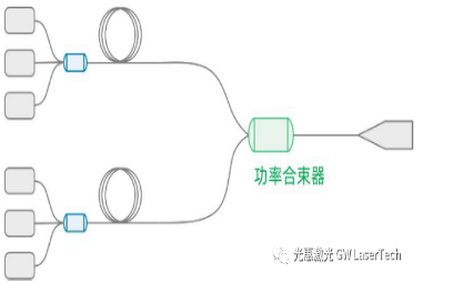 (2)功率合束器就是將多路單模激光合束到一根光纖中輸出,用來提高激光的輸出功率。