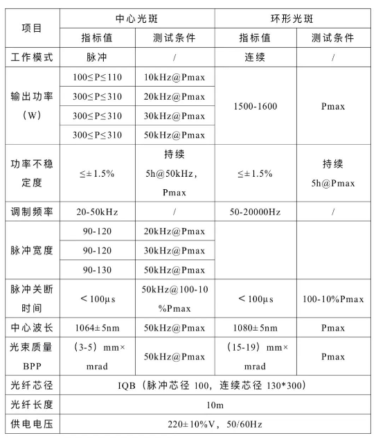 ABP環(huán)形復(fù)合清洗激光器詳細(xì)技術(shù)參數(shù)表,包括實(shí)際測(cè)量功率值,單脈沖能量以及脈寬、芯徑、光束質(zhì)量等相關(guān)參數(shù)標(biāo)準(zhǔn)。具體如下: