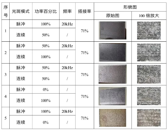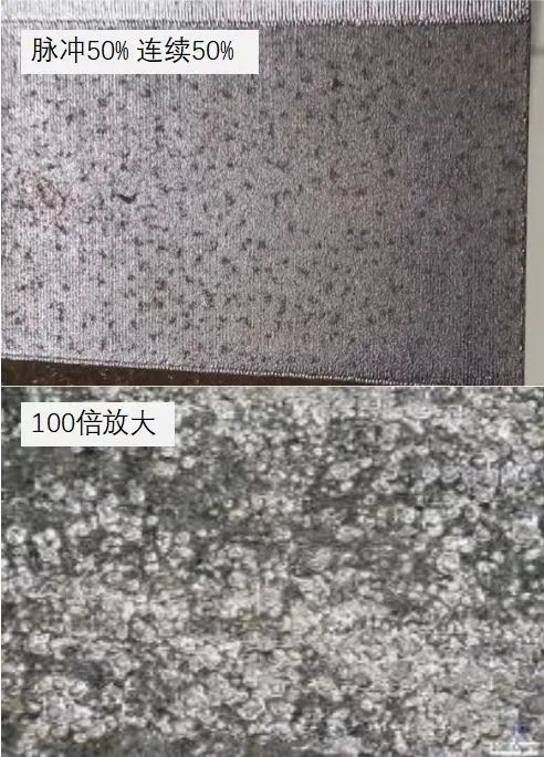在搭接率相同的情況下,改變環(huán)形光斑兩路光功率百分比分布,發(fā)現(xiàn)連續(xù)光高功率輸出,碳鋼板銹層清除的更徹底,見基材金屬光澤較明顯,單純脈沖光還有銹層殘留,并且在該移動(dòng)速度下縱向光斑沒有搭接上,需要連續(xù)光互補(bǔ)。在相同移動(dòng)速度下,效果最佳的兩路光組合是脈沖光50%和連續(xù)光100%同時(shí)輸出。
