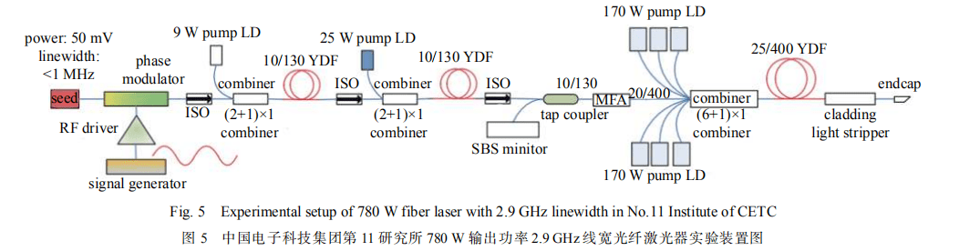 2014 年, 中國電子科技集團(tuán)有限公司第 11 研究所利用正弦調(diào)制方式將單頻激光器的光譜線寬展寬為2.9 GHz,采用三級放大結(jié)構(gòu)進(jìn)行放大,實(shí)驗(yàn)裝置如圖 5 所示。采用 976 nm 的半導(dǎo)體激光器泵浦基于 25/400 光纖的主放大系統(tǒng)進(jìn)行放大,激光器最終輸出功率達(dá)到了 780 W,光譜線寬保持為 2.9 GHz,光束質(zhì)量為