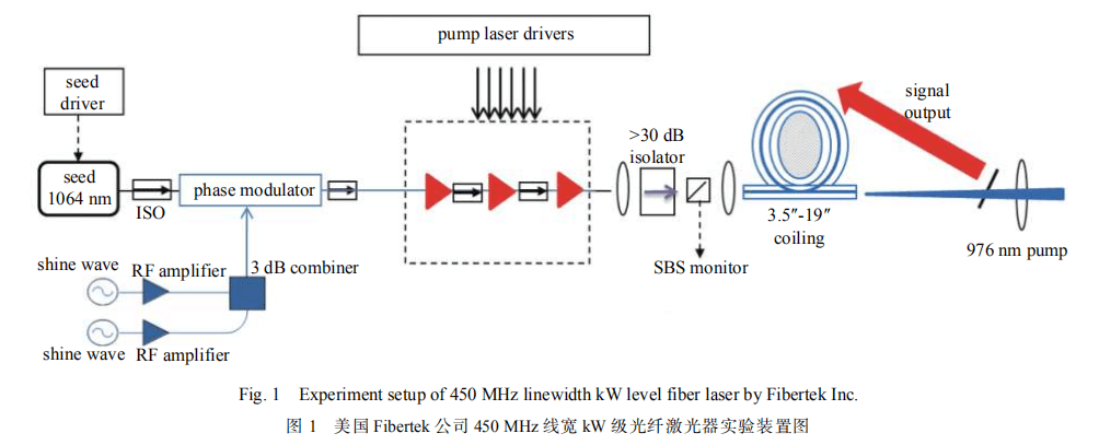 2011 年,美國 Fibertek 公司的 Doruk Engin 等報(bào)道了線寬為 450 MHz,輸出功率達(dá)到 1 kW 的光纖激光器,實(shí)驗(yàn)裝置如圖 1 所示。采用雙通道正弦信號調(diào)制單頻種子光,將線寬展寬為 450 MHz,再經(jīng)過三級放大實(shí)現(xiàn) 1 kW 激光輸出。主放大級采用 35/500 的增益光纖以降低纖芯中的功率密度, 抑制 SBS 效應(yīng), 輸出激光的光束質(zhì)量為M2<1.4[18]。