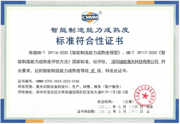 此次百超迪能獲得“智能制造能力成熟度等級——貳級”證書,是對百超迪能標(biāo)準(zhǔn)化作業(yè)流程和智能制造實力的認(rèn)可 。未來,百超迪能將繼續(xù)聚焦激光切割設(shè)備制造領(lǐng)域,助力行業(yè)智能制造發(fā)展貢獻(xiàn)自身力量。