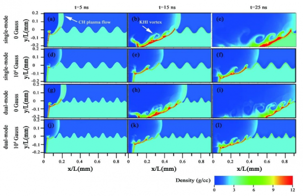 數(shù)值模擬表明,水平流向外加磁場(chǎng)可抑制單模KHI渦旋發(fā)展和多模KHI渦旋的并合過(guò)程,外加磁場(chǎng)對(duì)多模擾動(dòng)KHI的演化具有更加強(qiáng)烈的制穩(wěn)效果,在25納秒內(nèi)KHI的平均增長(zhǎng)率降低了20%。研究結(jié)果可為在強(qiáng)磁環(huán)境下利用強(qiáng)激光裝置開(kāi)展KHI實(shí)驗(yàn)提供理論指導(dǎo),對(duì)慣性約束聚變前沿研究具有重要意義。