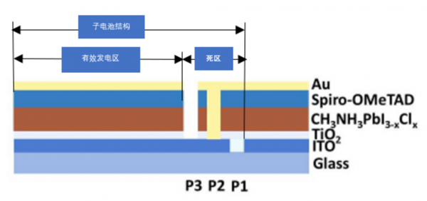 對于鈣鈦礦薄膜太陽能模組來說,死區(qū)是一個非常關(guān)鍵的技術(shù)指標(biāo)。眾所周知,薄膜太陽能模組是由一百多個子電池串聯(lián)起來組成的,每個子電池包含兩個區(qū)域:不能發(fā)電的死區(qū)與可以發(fā)電的有效區(qū),死區(qū)越小,有效發(fā)電面積就越大,模組的輸出功率就越大。