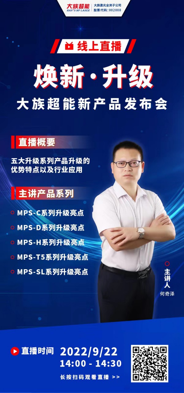 拿出手機掃一掃以下海報二維碼,即可觀看大族超能五大系列產(chǎn)品全新升級發(fā)布會的現(xiàn)場直播!