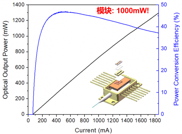 應(yīng)用與背景 高壽命可靠性全光網(wǎng)絡(luò)作為大容量光通信的基礎(chǔ),摻鉺光纖放大器(EDFA)可以進行光信號的直接放大,是實現(xiàn)全光網(wǎng)絡(luò)的關(guān)鍵部件,而980nm泵浦激光芯片及模塊則是EDFA的心臟與核心。另外980nm激光泵浦源在海底通訊、衛(wèi)星激光與空間通信、光纖陀螺、超快激光泵浦源、激光雷達(用于測繪、測風(fēng)、以及3D感知)等方面都具有極其重要的作用。 應(yīng)用原理與技術(shù)路線 通過980nm激光泵浦源泵浦摻鉺光纖,可以實現(xiàn)基于波分復(fù)用技術(shù)的1550nm的信號光的放大,從而實現(xiàn)大容量、遠距離的光信號傳輸。 基于980nm激光泵浦源的EDFA光信號放大原理圖 技術(shù)難點 通信級高功率單模980nm半導(dǎo)體激光泵浦模塊的核心關(guān)鍵為單模980nm激光芯片,這款芯片要求極高,包括極高的電流密度、極高的光功率密度、極高的可靠性要求,相對于目前的工業(yè)應(yīng)用產(chǎn)品,在可靠性、電流密度和功率密度等重要參數(shù)方面都要高1到2個數(shù)量級,開發(fā)難度很大。 難點包括: 1)高單模輸出功率和高電光轉(zhuǎn)換效率問題 2)極高腔面光功率密度導(dǎo)致的災(zāi)變性光學(xué)腔面損傷問題 3)極高電流密度和極高功率密度工作條件下的極高可靠性要求 針對通信級單模980nm半導(dǎo)體激光芯片與模塊的“卡脖子”問題,在芯片設(shè)計、外延材料生長、前端制備工藝、后端制備工藝、封裝測試分析、可靠性與失效分析等六大模塊進行了系統(tǒng)性深入研究,突破了芯片和模塊研制過程中IDM體系的諸多關(guān)鍵技術(shù)和工藝,歷經(jīng)4年的艱苦努力,成功開發(fā)了高功率、高效率和高可靠性單基橫模半導(dǎo)體激光芯片與模塊的系列產(chǎn)品,實現(xiàn)了從外延材料、芯片到模塊的全制程完全自主可控。 980nm單基橫模激光芯片的典型光電特性曲線 980nm單模光纖耦合模塊的典型光電特性曲線 形成的主要系列產(chǎn)品 1)900mW單模芯片產(chǎn)品,典型電光轉(zhuǎn)換效率58%,在600mW和900mW工作條件下壽命可靠性(@60% CL)分別優(yōu)于100FIT和500 FIT;以此開發(fā)的14pin蝶形封裝模塊獲得光纖輸出400-600mW系列產(chǎn)品。 2)1300mW單模芯片產(chǎn)品,典型電光轉(zhuǎn)換效率52%,在900mW和1300mW工作條件下壽命可靠性(@60% CL)分別優(yōu)于100FIT和500FIT。以此開發(fā)的14pin蝶形封裝模塊獲得光纖輸出600-1000mW系列產(chǎn)品。 以上系列產(chǎn)品均通過了Telcordia GR-468-CORE通信標(biāo)準(zhǔn)驗證。
