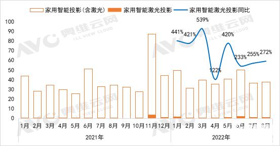 近期,奧維云網(wǎng)發(fā)布消息稱:2022 年 1-8 月,家用激光投影銷量達 11.1 萬臺,同比增長 301%;銷額 6.7 億元,同比增長 239%。