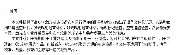 本文件適用于預(yù)期用于工業(yè)制造以及預(yù)期不用于工業(yè)制造,但可能會被用戶在合理條件下用于制造的3B類或4類激光產(chǎn)品,包括嵌入3B類或4類激光光源的制造設(shè)備。本文件不適用于包括娛樂、演示、校準、測量、教育和醫(yī)療等用途的激光產(chǎn)品。