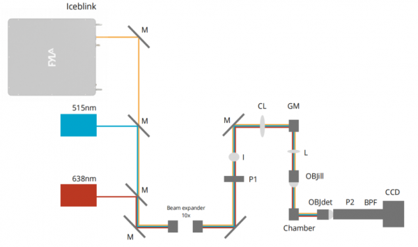 這種設(shè)置包括一個超連續(xù)激光光源(Iceblink),兩個用于引導(dǎo)光線的鏡子,一個(或兩個,取決于探測器)中性密度濾光片,用于降低光線強度,避免飽和相機和偏振器。