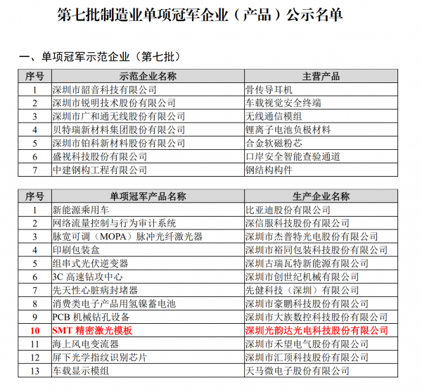近日,工業(yè)和信息化部、中國(guó)工業(yè)經(jīng)濟(jì)聯(lián)合會(huì)組織開(kāi)展的第七批制造業(yè)單項(xiàng)冠軍企業(yè)(產(chǎn)品)和第一批、第四批制造業(yè)單項(xiàng)冠軍企業(yè)(產(chǎn)品)評(píng)選已審核完成并正式公布。光韻達(dá)旗下SMT精密激光模板憑借單一產(chǎn)品數(shù)量及銷售額國(guó)內(nèi)第一的硬實(shí)力成功入選“單項(xiàng)冠軍產(chǎn)品”。