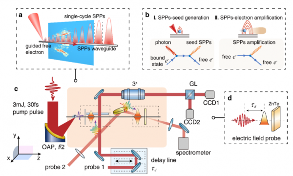 相比自由空間中傳播的光場,以SPP為代表的表面光場具有亞波長壓縮和近場增強的優(yōu)異特性,近年來已逐步應用于新一代無線通信、納米尺度的成像與探測等諸多領(lǐng)域,并有望為集成光電子器件的開發(fā)以及光譜探測、傳感、信息處理等領(lǐng)域的應用帶來變革性的技術(shù)影響。目前國際上產(chǎn)生表面光場主要有電子直接激發(fā)與波導耦合兩種方式,然而不論對于何種方式,所產(chǎn)生的表面光場都受限于低耦合效率導致的弱光場能量,進而限制了SPP在上述領(lǐng)域的應用。因此,發(fā)展相干的高功率SPP光源是該領(lǐng)域亟待解決的問題。
