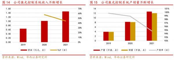 高精密振鏡控制系統(tǒng)深耕多年,營收不斷增長。2019-2021年公司激光加工控制系統(tǒng)的營業(yè)收入分別為0.65億元、1.02億元和1.47億元,呈現(xiàn)快速增長態(tài)勢(shì);激光加工控制系統(tǒng)銷量較上期同比增長52.94%、109.32%、47.89%,產(chǎn)品銷量大幅增長。同時(shí),公司通過價(jià)格調(diào)整、開發(fā)新產(chǎn)品等方式擴(kuò)大銷量。