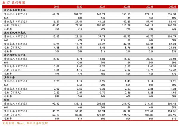 2022年激光行業(yè)整體承壓,或?qū)臼杖攵嗽斐梢欢ㄓ绊憽?022-2023年通用行業(yè)復(fù)蘇預(yù)期強(qiáng)烈,疊加公司不斷拓展新的產(chǎn)品與行業(yè),各個(gè)業(yè)務(wù)板塊有望恢復(fù)高增,毛利率水平也有望維持較好的水平且略有提升。