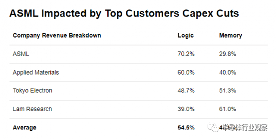 Khaveen Investments數(shù)據(jù)顯示,存儲業(yè)務(wù)是Lam Research最大的業(yè)務(wù),61%的營收來自于此;TEL的存儲收入占了51.3%,TEL日前下修財測的原因中就包括了內(nèi)存廠商變更或延后設(shè)備投資;AMAT的存儲收入則占了40%;相比下ASML 29.8%的存儲收入占比遠(yuǎn)低于其他幾家設(shè)備廠商,因此其受到的資本縮減影響也相對較少。