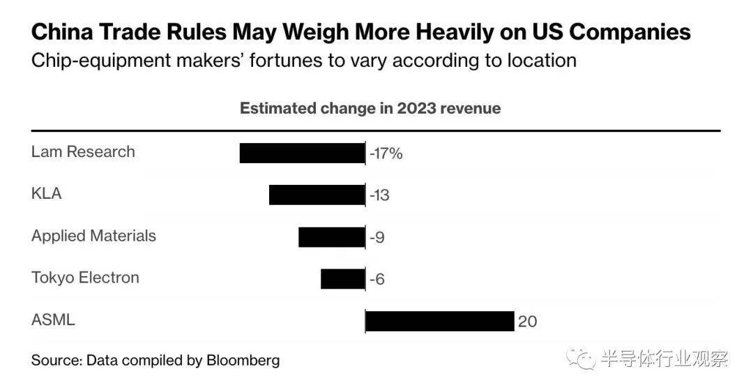 據(jù)彭博社報道,分析師預(yù)計Lam Research、KAL、AMAT這三家美國公司的明年收入下降幅度將超過日本同行。Lam Research 已經(jīng)預(yù)計2023年在華收入減少20億-25億美元,KAL也初估受美禁令影響明年營收損失達9億美元,雖然日本的TEL營收也受到了影響,但相比上述三家,影響較少。