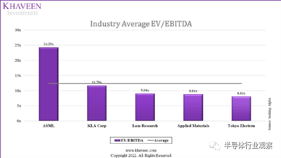 這家光刻機(jī)龍頭似乎總有一股魔力,哪怕在10月份,整體半導(dǎo)體設(shè)備廠商的股價(jià)都步入低谷之際,ASML依舊讓投資機(jī)構(gòu)給出了超凡的估值。Khaveen Investments在10月11日的報(bào)告中,給出了ASML 24.29x的企業(yè)估值數(shù)據(jù),而他們認(rèn)為半導(dǎo)體設(shè)備行業(yè)平均EV / EBITDA (EV/EBITDA 又稱企業(yè)價(jià)值倍數(shù),是一種被廣泛使用的公司估值指標(biāo))僅為12.37 x,是 ASML的一半,其余KLA、Lam Research、應(yīng)用材料、Tokyo Electron (TEL)等幾家設(shè)備巨頭的估值甚至皆未達(dá)到均值。