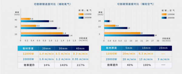 輔助氧氣條件下,在切割30mm和40mm的碳鋼時,20KW的激光切割機優(yōu)勢非常明顯,切割效率比12KW的分別提升了約1.5倍和2倍。