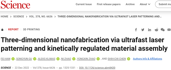 為了解決上述問題,來自香港中文大學(xué)SHIH-CHI CHEN教授(陳教授)、卡內(nèi)基梅隆大學(xué) YonGXIN ZHAO教授(趙教授)進(jìn)行了合作,提出了一種利用包括金屬、金屬合金、二維材料、氧化物、金剛石、上轉(zhuǎn)換材料、半導(dǎo)體、聚合物、生物材料、分子晶體和油墨的材料庫來制造任意3D納米結(jié)構(gòu)的策略。他們的研究成果已經(jīng)發(fā)表在了《Science》上,題目為《Three-dimensional nanofabrication via ultrafast laser patterning and kinetically regulated material assembly》(《通過超快激光圖案和動力學(xué)調(diào)節(jié)的材料組裝進(jìn)行三維納米制造》)。