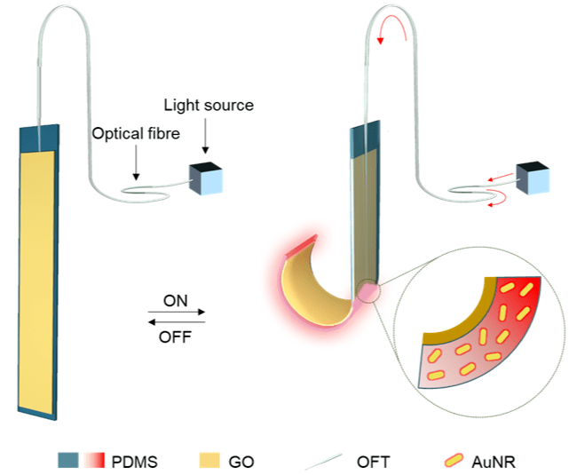 光波導(dǎo)型致動(dòng)器的材料選擇,一般采用技術(shù)相對(duì)成熟的普通商用光纖。但商用光纖整體厚度大(直徑多在125微米)、光耦合效率低、能量密度低,導(dǎo)致其變形幅度小、速度慢,無(wú)法滿足很多實(shí)際應(yīng)用需求。如果1毫瓦的微弱光線經(jīng)由100微米以上的光纖傳導(dǎo)至致動(dòng)器,光的能量密度并不高,且會(huì)因?yàn)楣饫w和光響應(yīng)材料的尺寸不匹配,導(dǎo)致不少能量散失。