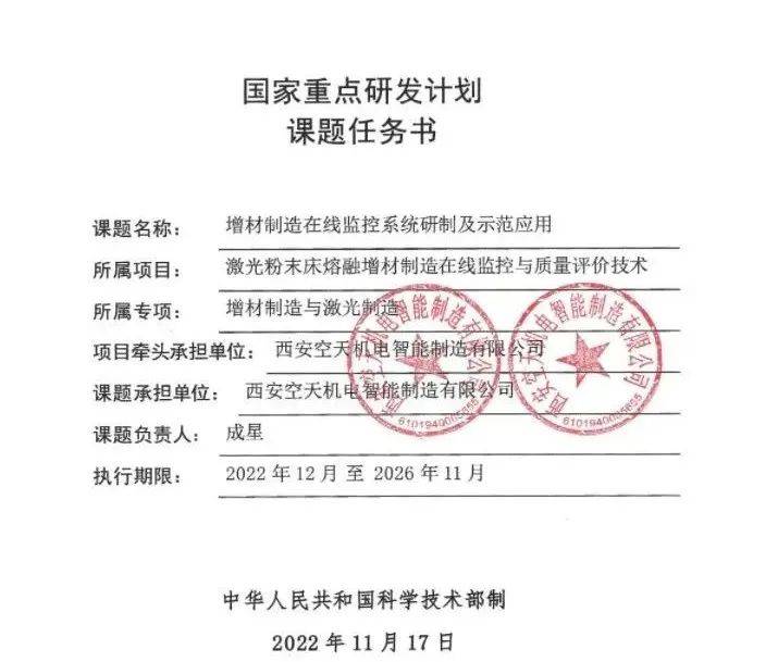 近期,2022年國(guó)家重點(diǎn)研發(fā)計(jì)劃項(xiàng)目評(píng)審結(jié)果公布,由西安空天機(jī)電智能制造有限公司(以下簡(jiǎn)稱“西空智造”)牽頭申報(bào)的國(guó)家重點(diǎn)研發(fā)計(jì)劃“增材制造與激光制造”重點(diǎn)專項(xiàng)“激光粉末床熔融增材制造在線監(jiān)控與質(zhì)量評(píng)價(jià)技術(shù)”項(xiàng)目獲批立項(xiàng)。