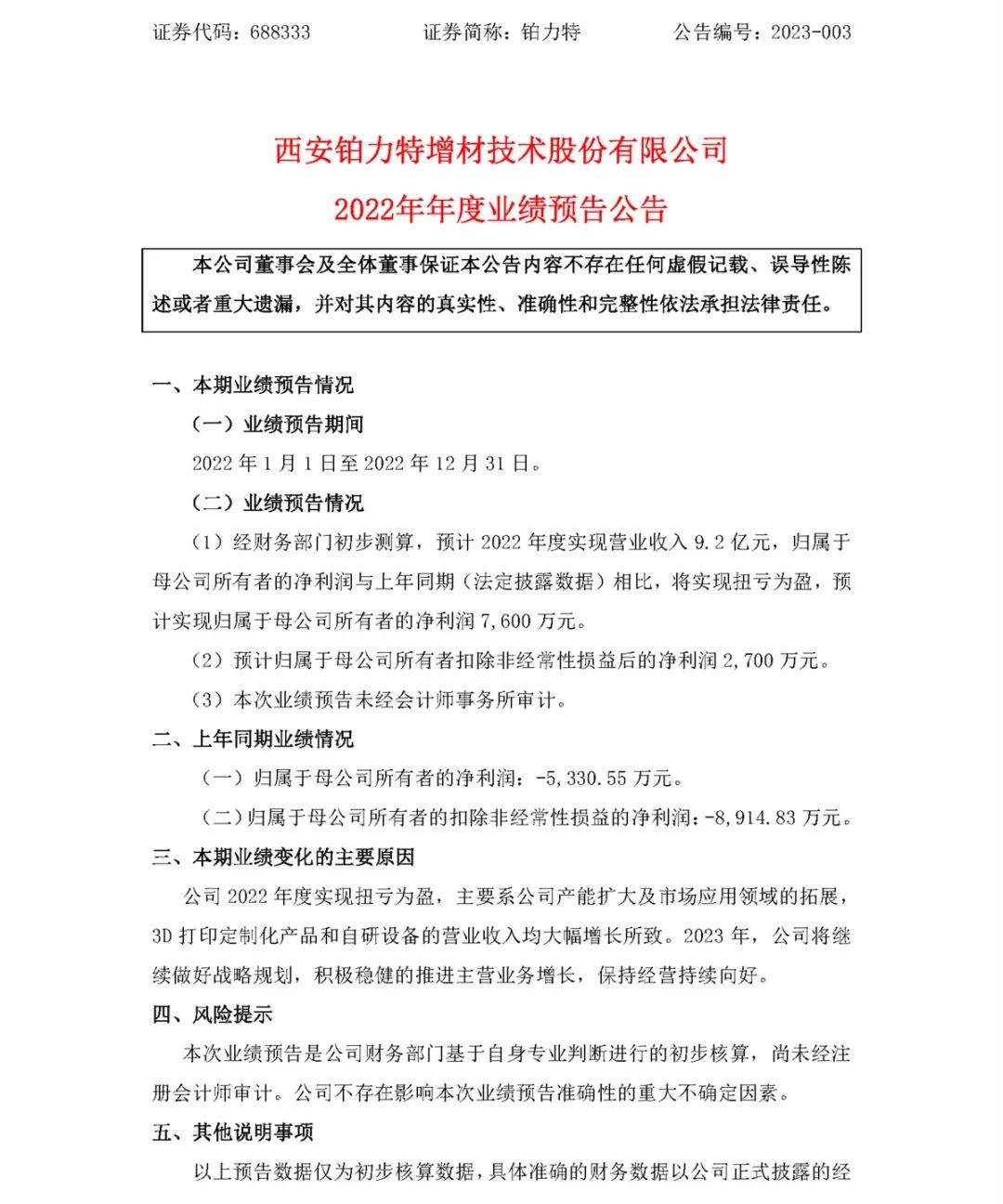 2023年1月31日,長三角G60激光聯(lián)盟陳長軍獲悉,金屬3D打印設(shè)備和服務(wù)商鉑力特近日發(fā)布了2022年的業(yè)績預(yù)告。鉑力特預(yù)計 2022 年度實(shí)現(xiàn)營業(yè)收入 9.2 億元,將實(shí)現(xiàn)扭虧為盈,預(yù)計實(shí)現(xiàn)歸屬于母公司所有者的凈利潤 7,600 萬元。