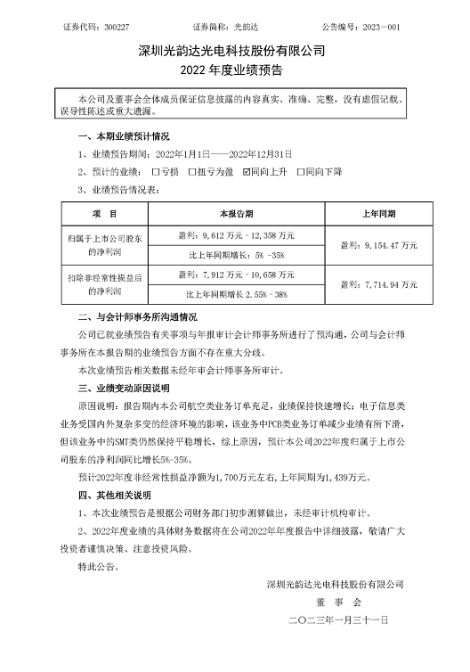 2023年2月,南極熊獲悉,光韻達(300227.SZ)近日發(fā)布業(yè)績預(yù)告,預(yù)計2022年度凈利潤9612萬元–1.24億元,同比增長5%-35%;扣除非經(jīng)常性損益后的凈利潤7912萬元–1.07億元,比上年同期增長2.55%–38%。