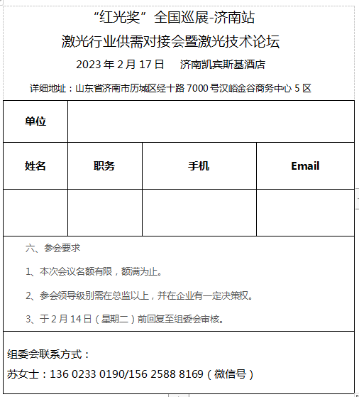 “紅光獎(jiǎng)”自2018年啟動(dòng)至今,已連續(xù)成功舉辦了五屆,紅光獎(jiǎng)”已成為國(guó)內(nèi)激光行業(yè)備受關(guān)注的一項(xiàng)評(píng)選活動(dòng),碩果累累,見(jiàn)證了激光行業(yè)涌現(xiàn)的部分優(yōu)秀企業(yè)和創(chuàng)新產(chǎn)品,忠實(shí)記錄了行業(yè)發(fā)展的每一個(gè)印記,取得了良好的效果。紅光獎(jiǎng)”全國(guó)巡展-濟(jì)南站激光行業(yè)供需對(duì)接會(huì)暨激光技術(shù)論壇將在濟(jì)南凱賓斯基酒店舉辦,期待業(yè)界人士的參與,并能碰撞出思想與交流的火花,為激光行業(yè)發(fā)展獻(xiàn)計(jì)獻(xiàn)策!