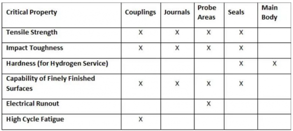 修復(fù)軸上最常見的損壞位置包括聯(lián)軸器配合、軸頸、探頭區(qū)域、密封區(qū)域和主體。由于修復(fù)過程的性質(zhì)(熔敷焊縫和HAZ的形成),據(jù)了解,修復(fù)區(qū)域的特性將與原始軸材料的特性不匹配。此外,軸的每個(gè)部分都有自己的一套設(shè)計(jì)標(biāo)準(zhǔn)。因此,確保修復(fù)區(qū)域滿足每個(gè)修復(fù)位置的最低設(shè)計(jì)要求非常重要。考慮到這一點(diǎn),下面討論了軸的每個(gè)區(qū)域應(yīng)考慮的關(guān)鍵特性。此信息的摘要見表 2。表 2:基于修復(fù)位置的關(guān)鍵材料屬性。1.主軸體
