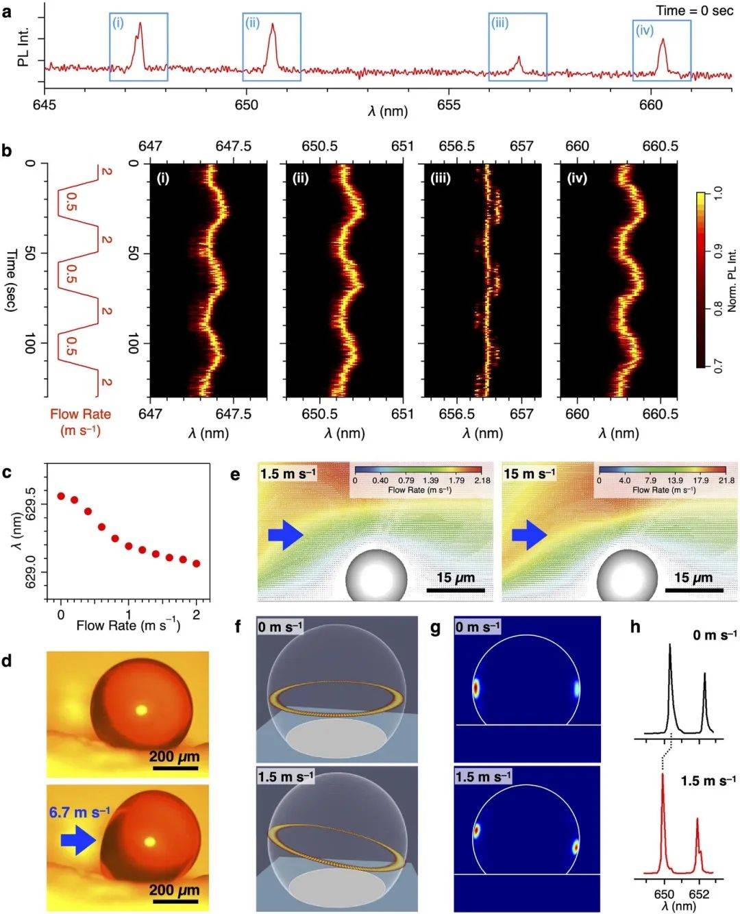 圖2:a) 在用ns激光器進(jìn)行強(qiáng)光泵浦時(shí),N2下微IL的μ-PL光譜以0.5 m s?1的速率流動(dòng)。b) 改變N2流速時(shí)μ-PL光譜變化。(i)至(iv)放大了(a)中的相應(yīng)光譜范圍。c) 繪制激光峰從微 IL 激光腔(直徑 = 7.1 μm)的光譜偏移作為 N2 流速的函數(shù)圖。d) 如藍(lán)色箭頭所示,在施加 6.7 m s?1的 N2 流之前和之后的大微 IL 液滴的代表性顯微圖像。e)CFD 模擬了 1.5 和 15 m s?1氣流下微 IL 液滴的形態(tài)。藍(lán)色箭頭指示模擬流的方向。f-h)FDTD模擬了原始和變形液滴內(nèi)部光的電磁場(chǎng)分布f,g)和光學(xué)共振光譜h)。扭曲的形狀是從CFD模擬中獲得的。