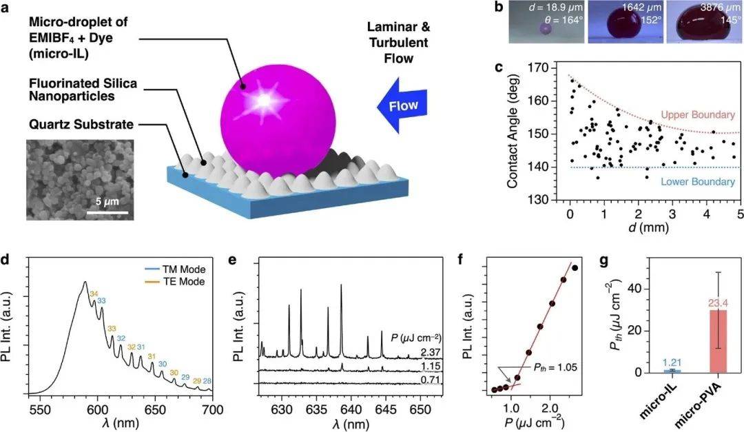 荷葉沾水珠而不濕,日本筑波大學(xué)研究人員借助這一“荷葉效應(yīng)”,利用簡(jiǎn)單的方法,制造出了一種新型離子液滴,這種微滴可用作靈活、持久而可調(diào)諧的激光器。相關(guān)研究以“ Pneumatically Tunable Droplet Microlaser”為題發(fā)表在《Laser&Photonics Reviews》上。