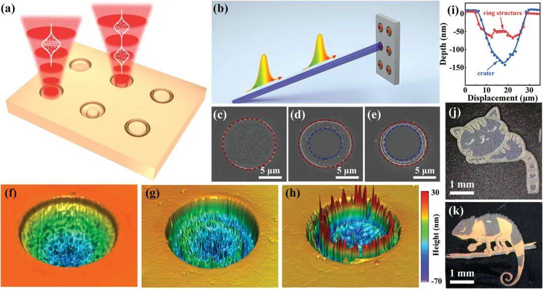 綜上所述,清華大學(xué)研究人員提出了一種新的超快激光微納加工技術(shù)結(jié)合瞬態(tài)固液轉(zhuǎn)變策略,在金屬表面制備獨特的咖啡環(huán)結(jié)構(gòu)。通過利用初始脈沖激勵調(diào)制金屬從固相到液相的瞬態(tài),隨后的超快脈沖誘導(dǎo)反沖壓力可以抑制等離子體發(fā)射,從而實現(xiàn)咖啡環(huán)結(jié)構(gòu)的可控制造。通過泵-探針實驗和TTM-MD模擬揭示了咖啡環(huán)結(jié)構(gòu)的形成機理。在較短的入射延遲時間(≈1 ~ 10ps),即晶格加熱到液態(tài)的短時間內(nèi),第二脈沖照射在固體材料上,形成圓形燒蝕坑。在延遲時間≈10-50 ps時,初始脈沖將晶格加熱至熔化溫度,第二次脈沖照射到液體材料上。第二個脈沖在液體材料中誘導(dǎo)了反沖壓力,抑制了熔化材料的去除,致使咖啡環(huán)結(jié)構(gòu)的形成。在較大的入射延遲時間(約50 ~ 200 ps)下,圓形燒蝕坑外圍熔融物質(zhì)凝固。當?shù)诙蚊}沖照射到再凝固的材料上時,咖啡環(huán)的外圍形成了穗狀結(jié)構(gòu)。此外,制備了各種不同結(jié)構(gòu)顏色的圖案,實現(xiàn)圖案化彩色打印應(yīng)用?;趯?材料相互作用的新探索,他們的研究提供了一種新的微納加工制造技術(shù)。