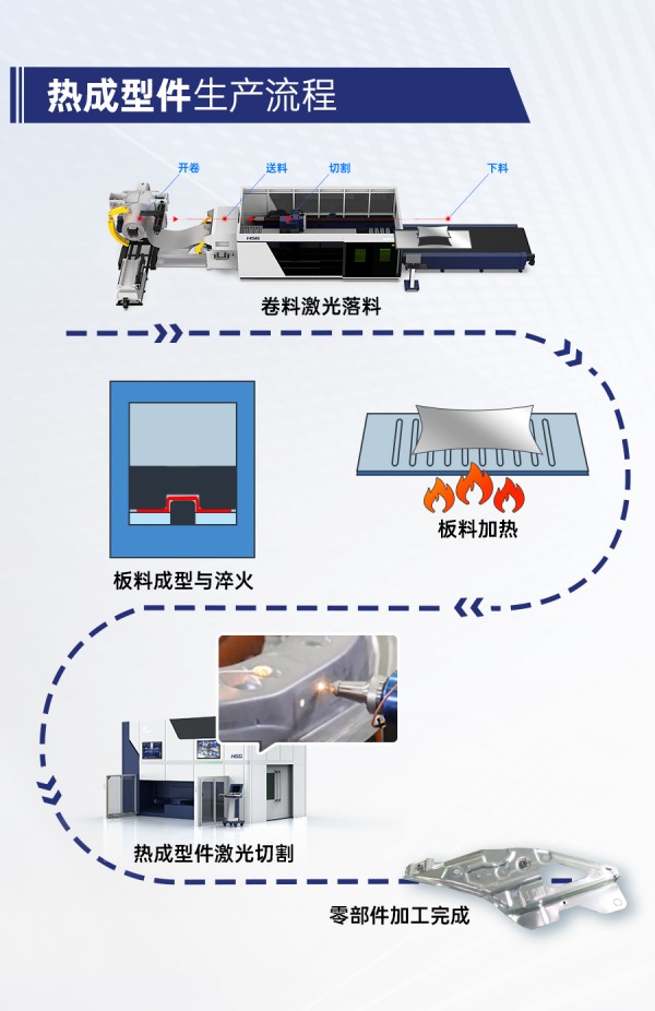 宏山激光GL系列卷料激光切割機(jī)搭配Cell系列三維五軸激光切割機(jī),可實(shí)現(xiàn)高強(qiáng)鋼料卷的自動化落料、以及熱成型三維工件的高精度切割,從生產(chǎn)工序上助力實(shí)現(xiàn)輕量化目標(biāo)。