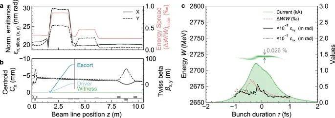 文中,研究人員展示了從頭到尾的模擬研究,如何從PWFA中產(chǎn)生具有前所未有的發(fā)射度和亮度的亞飛秒電子束,如何在不損失電荷的情況下傳輸它們,并在幾nm-rad級的發(fā)射度下完全保存,以及如何利用這些超亮光束進行阿秒埃級X-FEL脈沖生產(chǎn)。