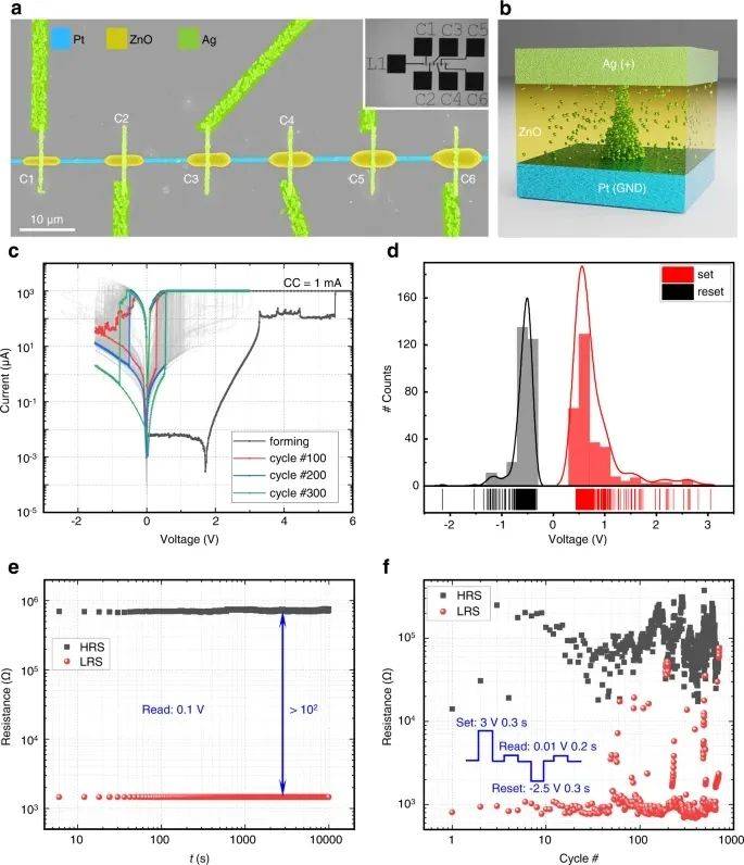 圖4a顯示了一個(gè)集成的1×6交叉memristor陣列,ZnO線寬從1.5μm (C1)增加到1.8μm (C2), 2.2μm (C3), 2.6μm (C4), 3.0μm (C5),到3.5μm (C6),線寬為0.6μm的單根Pt線上連接到激光打印接觸墊L1。6根ZnO棒材沿Pt線等距打印,間距為15 μm,并通過線寬為~0.72 μm的銀線層連接到接觸墊上(見圖4a所示整體結(jié)構(gòu))。