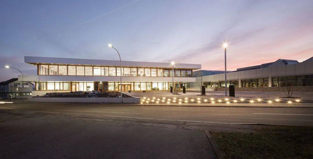 多功能建筑高約1.6 米,且立面由木玻璃結(jié)構(gòu)和水平鋼帶組成,由于樓板彼此偏移,視野在懸臂、護(hù)墻帶和寬敞的露臺區(qū)域之間營造了景觀效果。