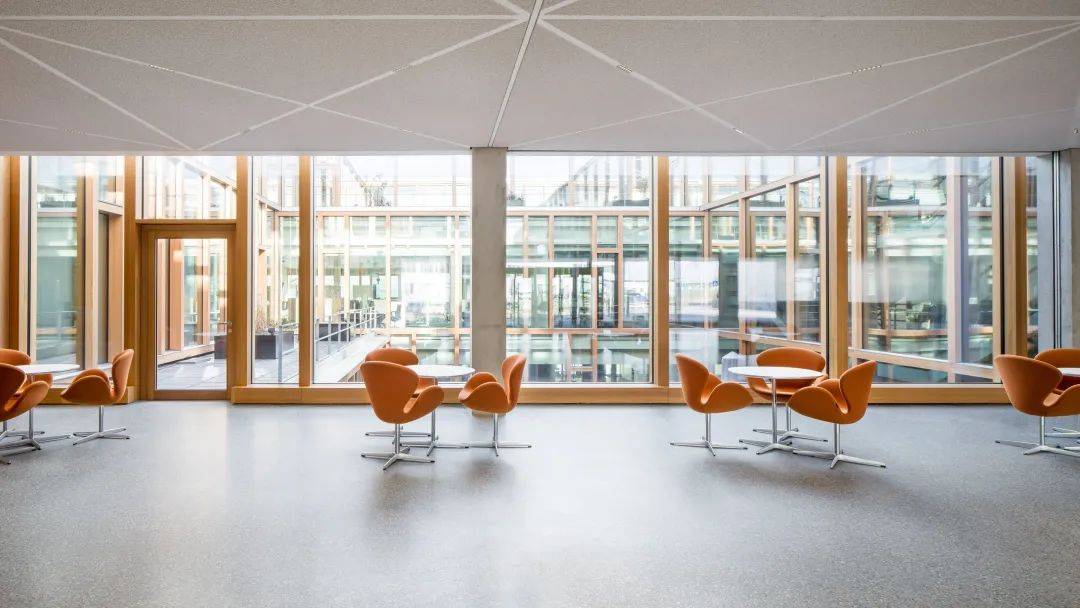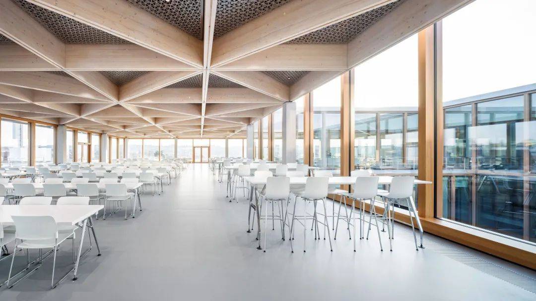 德國知名建筑設(shè)計(jì)事務(wù)所 Barkow Leibinger 公司設(shè)計(jì)了這座新建筑。“餐廳作為公司的亮點(diǎn),高覽壯闊的建筑空間聳立在施蘭貝格中,使餐廳與戶外景觀保持一致,并在令人振奮的木制屋頂下提供寧靜的音響效果。我們很高興能夠建造出通快員工理想中的建筑?!?建筑師 Regine Leibinger 說。該建筑矗立在60 x 60 米的區(qū)域中,并圍繞內(nèi)部庭院形成一個(gè)環(huán)形,這使得所有房間都有自然采光,且該餐廳足夠容納420位員工同時(shí)用餐。建筑共四層樓,地上三層,地下一層,在頂層,采用開放式木梁結(jié)構(gòu)與三角基本結(jié)構(gòu)建筑風(fēng)格。