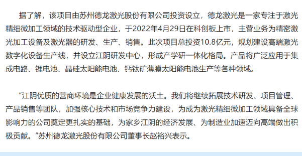 據(jù)了解,該項(xiàng)目由蘇州德龍激光股份有限公司投資設(shè)立,德龍激光是一家專注于激光精細(xì)微加工領(lǐng)域的技術(shù)驅(qū)動(dòng)型企業(yè),于2022年4月29日在科創(chuàng)板上市,主營(yíng)業(yè)務(wù)為精密激光加工設(shè)備及激光器的研發(fā)、生產(chǎn)、銷售。此次項(xiàng)目總投資10.8億元,規(guī)劃建設(shè)高端激光數(shù)字化設(shè)備生產(chǎn)線,并設(shè)立江陰研發(fā)中心,形成產(chǎn)學(xué)研一體化格局。產(chǎn)品將廣泛應(yīng)用于集成電路、鋰電池、晶硅太陽(yáng)能電池、鈣鈦礦薄膜太陽(yáng)能電池生產(chǎn)等各種領(lǐng)域。
