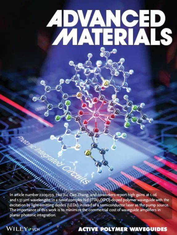 近日,廈門大學電子科學與技術(shù)學院張丹教授團隊與黑龍江大學化學化工與材料學院許輝教授團隊合作,在有機光子器件及其集成技術(shù)領(lǐng)域取得突破性進展,相關(guān)成果以“High-Gain of NdⅢComplex Doped Optical Waveguide Amplifiers at 1.06 and 1.31 μm Wavelengths based on Intramolecular Energy Transfer Mechanism”為題發(fā)表于Advanced Materials上,并被選為當期卷首文章(frontispiece)。