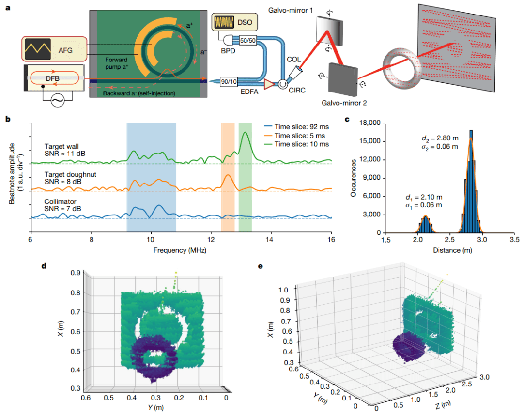 圖4:使用混合集成激光器的相干調(diào)頻連續(xù)波frequency-modulated continuous-wave,F(xiàn)MCW激光雷達(dá)演示。