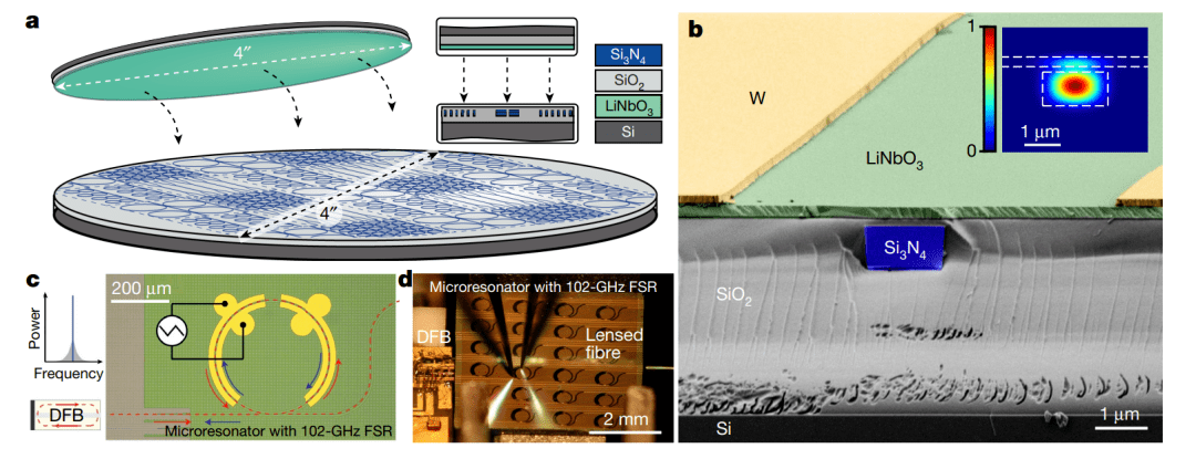 圖1:用于快速可調(diào)諧自注入鎖定激光器的異質(zhì)、低損耗氮化硅Si3N4–鈮酸鋰LiNbO3光子集成平臺。